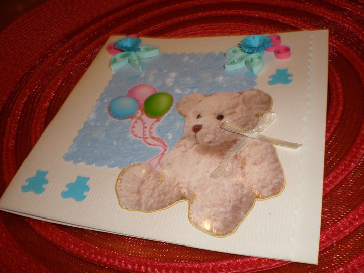 Přání k narození chlapečka s medvídkem. Obsahuje i quillingovou techniku.