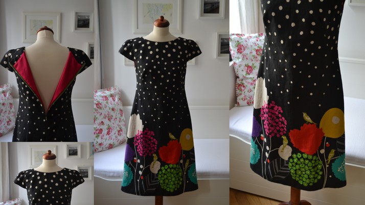 *Září 2013* šaty z látky od Etsuko Furuy, pevný len, celé podšité sytě růžovým saténem včetně rukávků. Provedena jedna zkouška během šití.