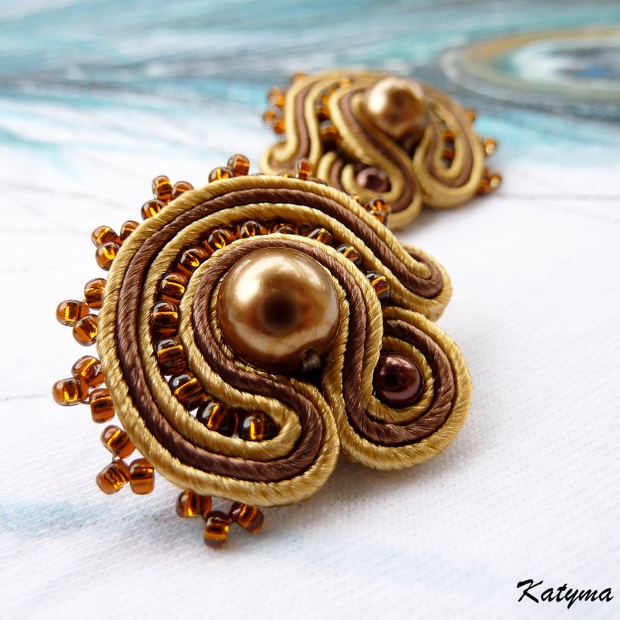 Náušnice klipsy vytvořené ze sutašek hnědé a béžové barvy a z béžových voskových perliček a hnědého rokajlu Preciosa.