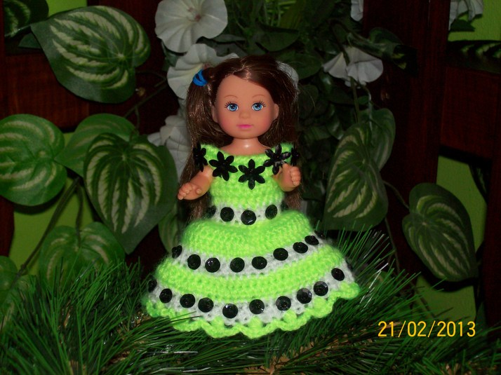 Háčkované šatičky pro panenku Evičku,zdobené bohatě flitry.