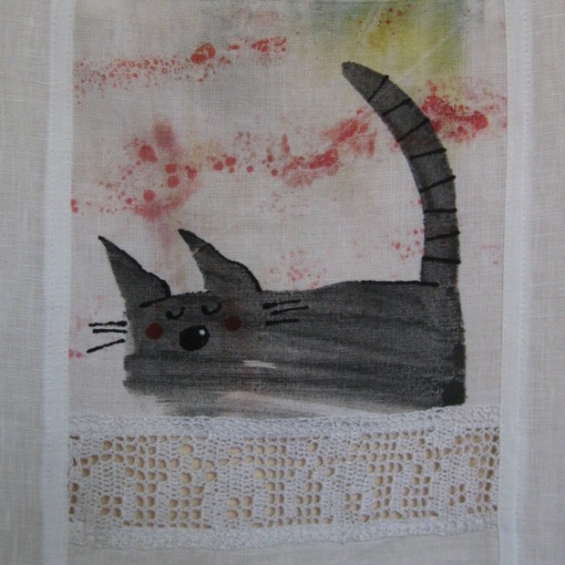 Halena s háčkovanou krajkou a tiskem kočičky na batikovaném lněném plátně