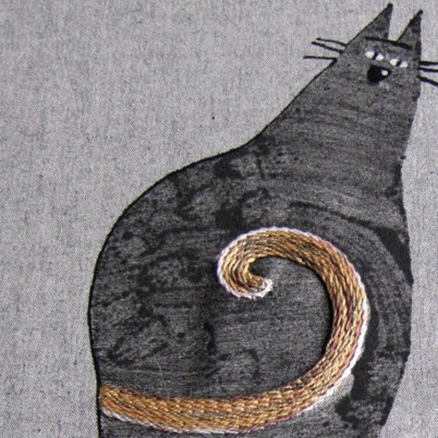 Motiv kočky - tisk na lněném plátně doplněn výšivkou melírovanou bavlnkou