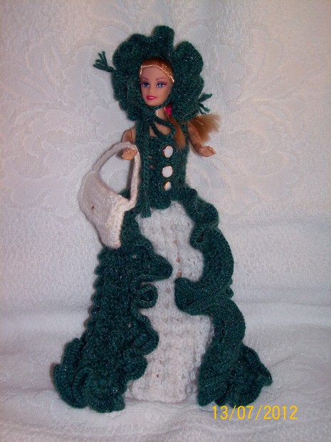 Doplněné háčkovaným kloboučkem a kabelkou.