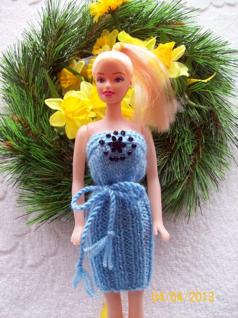 Světle modré, krátké pletené šaty pro panenku Barbie. Jsou zdobené černými flitry.