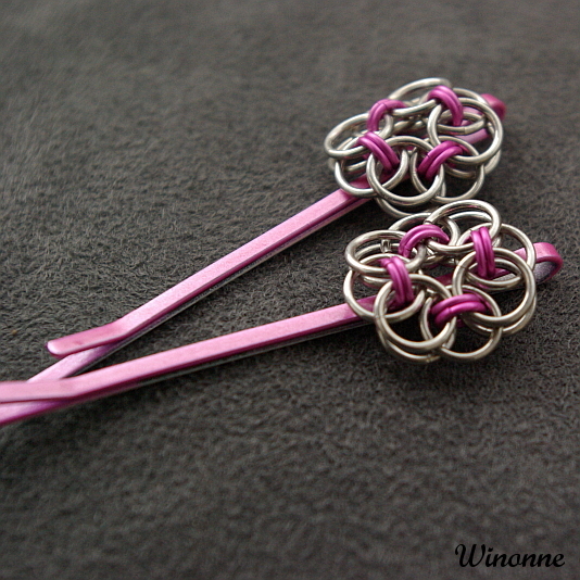 Růžové sponky s kroužkovanou ozdobou.