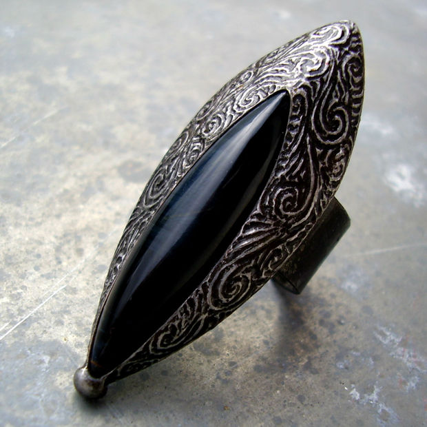 Cínovaný prsten se sokolím okem, průměr obroučky při nejužším stažení 1,9 cm