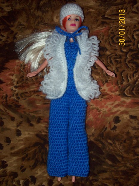 Třídílný obleček pro panenku BARBIE (overal, vesta, baret). Je háčkovaný z akrylu.