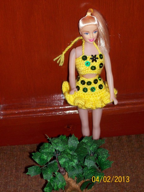 Háčkované šatičky pro Barbie na latinskoamerické tance. Jsou zdobené zelenými flitry.