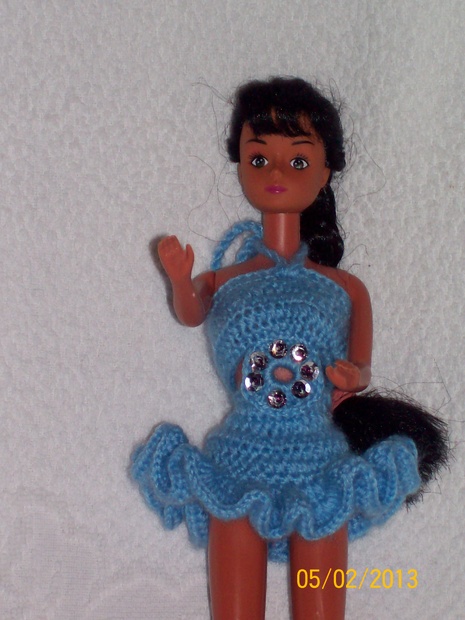 Šatičky pro Barbie na latinskoamerické tance. Jsou háčkované, zdobené černými flitry.