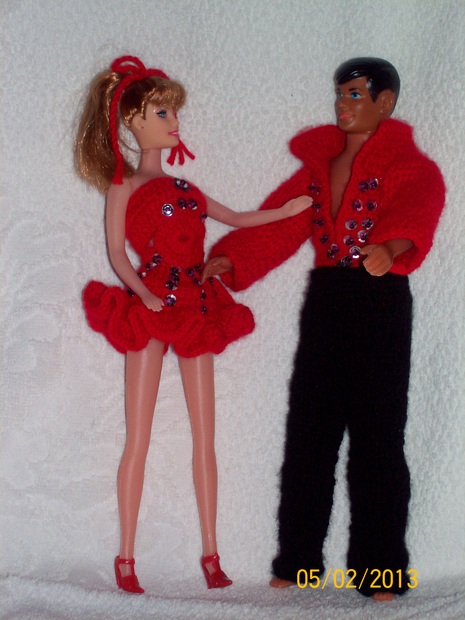 Taneční kostým na latinskoamerické tance pro Barbie a Kena. Kostými jsou háčkované, zdobené stříbrnými flitry.