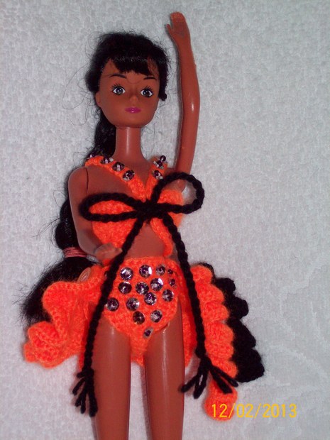 Háčkované taneční šaty pro Barbie, určené pro latinskoamerické tance.