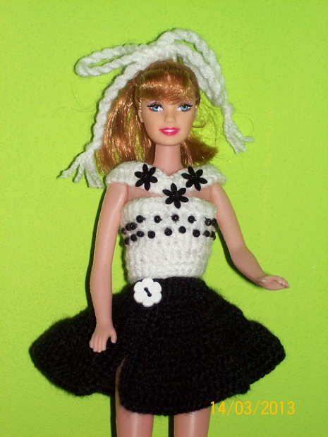 Háčkované šatičky pro panenku Barbie, zdobené flitry.