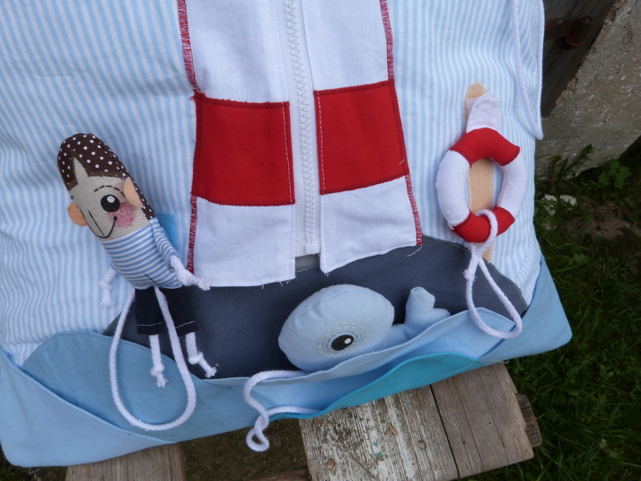 Všechny oddělitelné části (správce majáku, velryba, záchranný kruh, slunce i mrak) jsou k polštáři připevněný provázkem, aby se nikam nezatoulaly.
