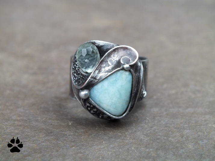 prsten s larimarem a broušeným chalcedonem, cín,drát,