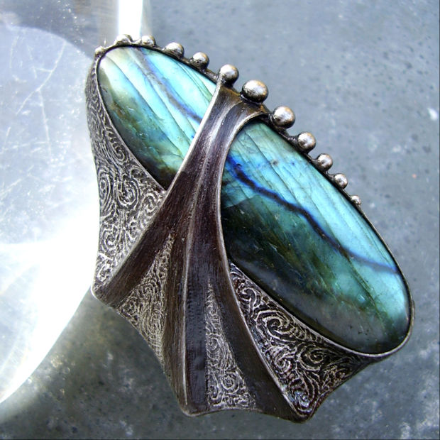 Cínovaný prsten s labradoritem. Průměr obroučky při nejužším stažení 1,9 cm.