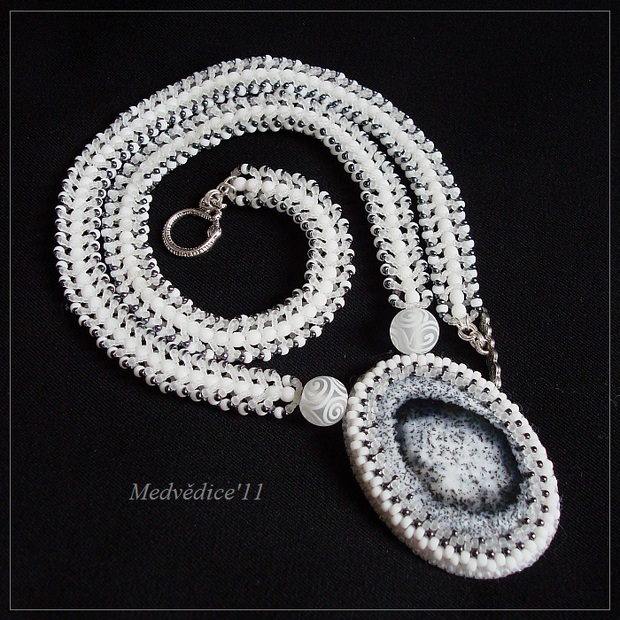 Náhrdelník vytvořený technikou korálkové výšivky a šitého šperku na téma Kouzla paní zimy z klubu Tisíc stehů.
