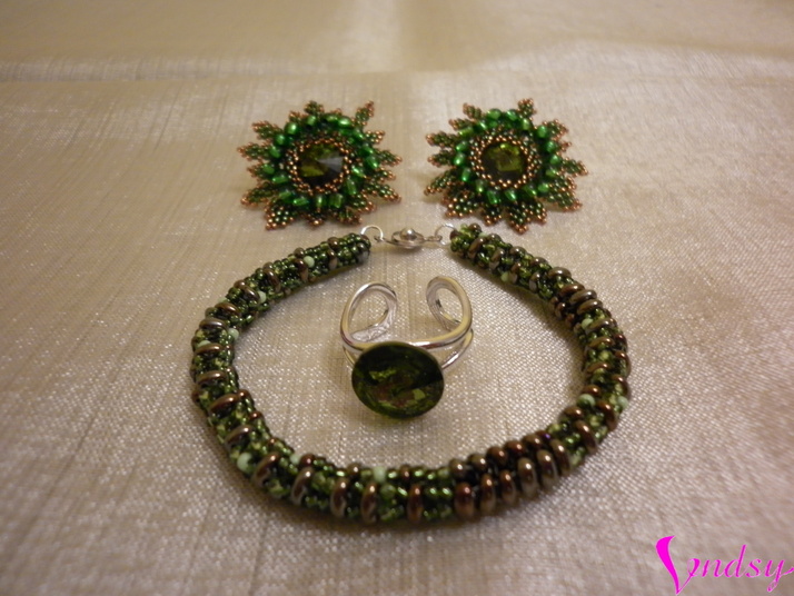 Obšité rivolky tmavě zelenou barvou. Prsten a šitý náramek k tomu.