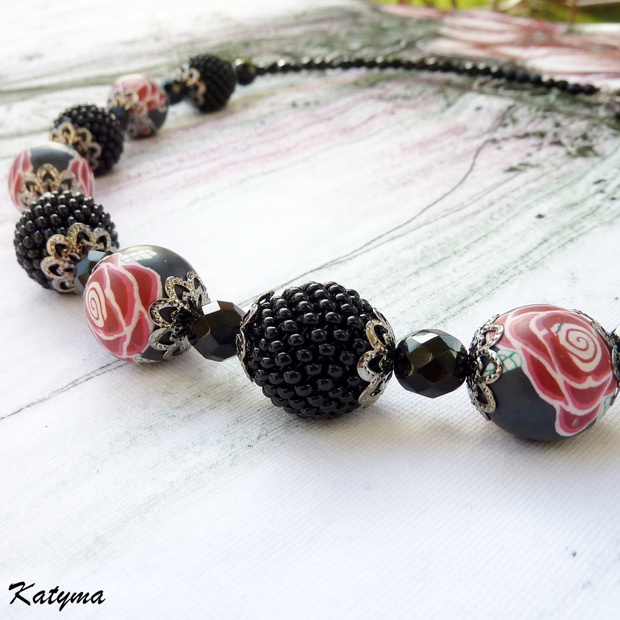 Náhrdelník z kuliček obšitých černým rokajlem a z fimo korálků s červenými růžičkami. Komponenty jsou v antracitové barvě.