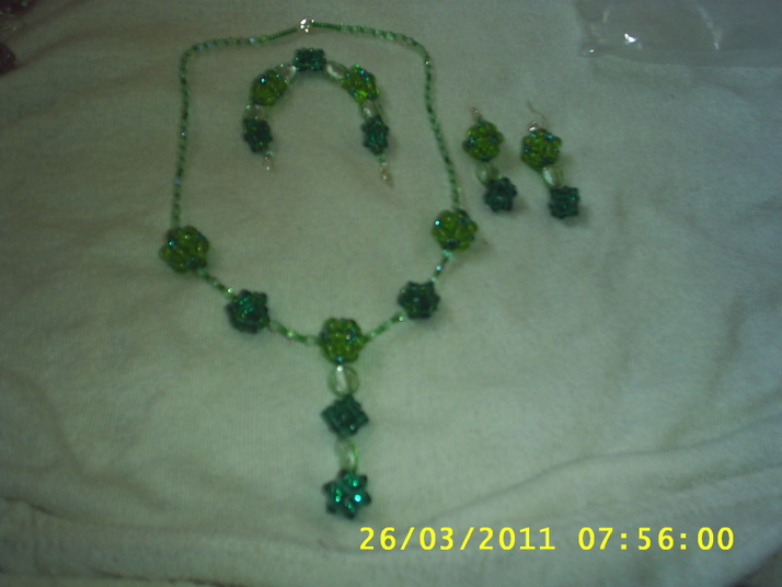 souprava je udělaná s kuliček různích zelených tvarů s mezidíly korálků podobné mentolkám.