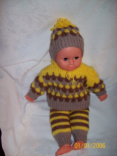 Třídílná soupravička pro panenku mimino, velké 40 cm. Vznikla kombinací dvou technik - háčkování a pletení.