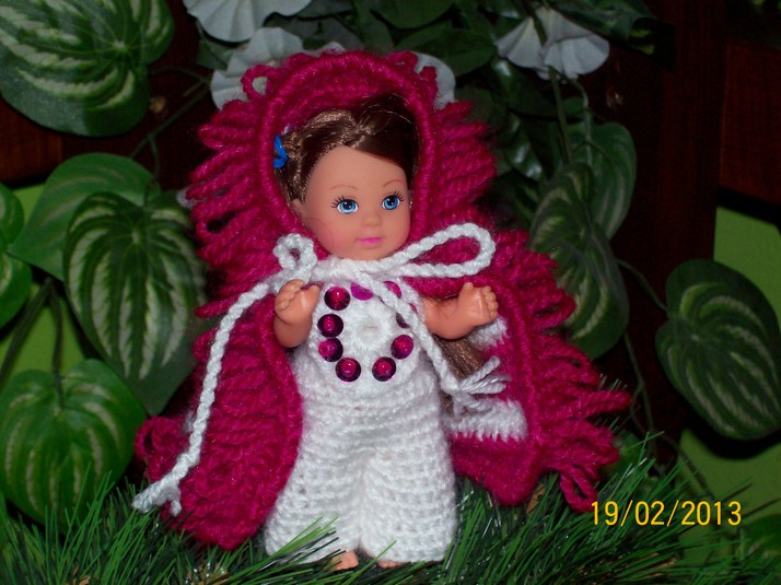 Pelerýnka pro malou panenku Evičku vznikla kombinací bílé a malinové vlny. Je háčkovaná.