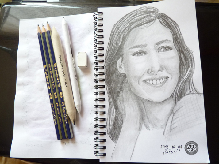 Kresba na téma první ze 365 výzev pro lidi, kteří tvoří tzv. "art journals" (umělecké deníky). Výzvou bylo slovo "Štěstí". Protože jsem chtěla nakreslit portrét, vybrala jsem si portrét usmívající se ženy. Použila jsem tužky Faber-Castell Goldfaber 2B, HB a 6B, 2 těrky a gumu. | POUČENÍ PRO PŘÍŠTĚ: Vždy začínat se světlejším stínováním, protože je mnohem jednodušší stínování ztmavit, než zesvětlit.
