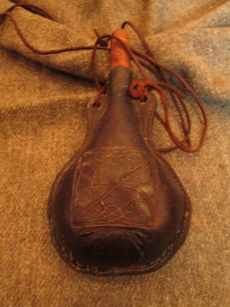 Ručně šitá, včelím voskem vylitá kožená čutora, obsah cca 1l. S vyřezávaným ornamentem