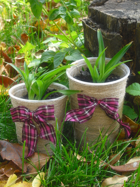 Květináčky z plastového kelímku, které jsou ozdobeny provázkem a mašličkou. Uvnitř květináčku se nachází rostlina zvaná