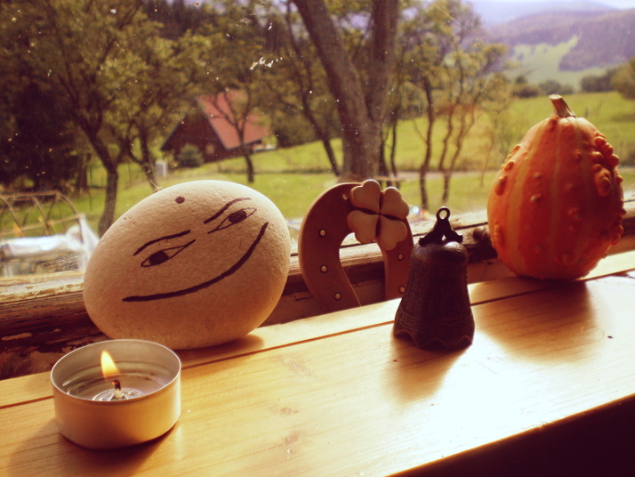 Podzimní zátiší na okně, takový malý oltářík se svíčkou, soškou Buddhy, kamenným přítelem a dalšími drobnostmi..