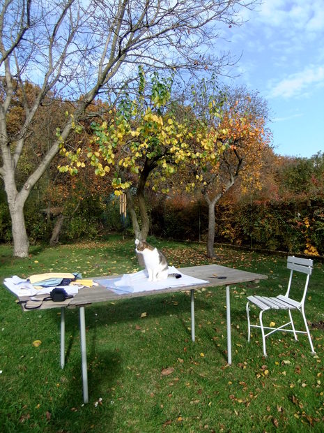 ...a tak Čuchi stříhá látky venku a kočka se jde podívat, co se děje...