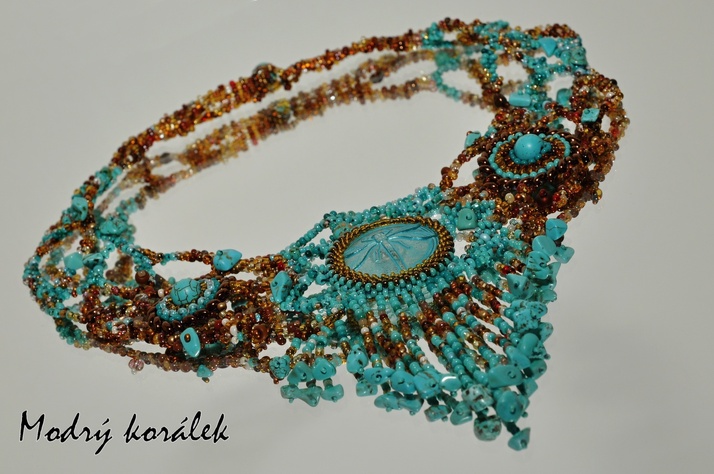 Freeformový náhrdelník v barvách písku a moře.