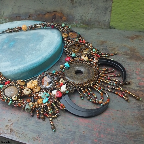 Freeformový náhrdelník - český a japonský rokajl, kostěné korálky, bronzit, amoniti