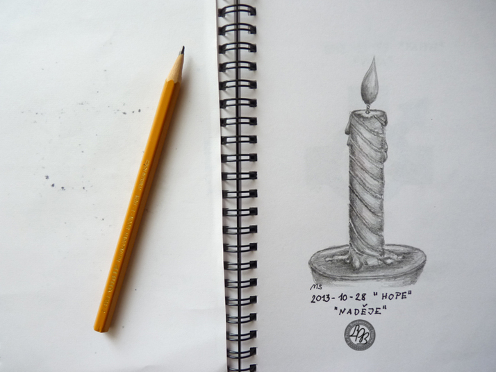 Kresba na zadané téma (výzvu). Tématem bylo slovo "Naděje". Použila jsem obyčejnou tužku. | POUČENÍ PRO PŘÍŠTĚ: Najít si tipy, jak to udělat, aby plamen nepůsobil jako "vyřezaný ze dřeva", ale jako skutečný plamen svíčky.