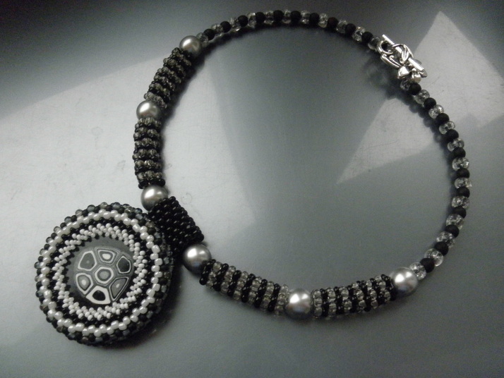 Dominantní přívěsek je ca 5,5 x 5,5 cm placka, též obšitý peyote stehem. Tento fimošek je z fimo dílny od báječné korálkářky Bijioux (a tímto doufám, že jsem její dílko moc neurazila :)