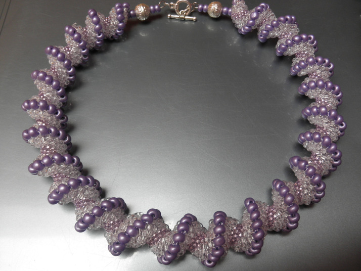 Náhrdelník je šitý Celliniho stehem, bílý průhlednáý rokajl tvoří dominantí část, dále malý fialový a velký fialový rokajl. Vystužené pamětovým drátem, americké zapínání.
