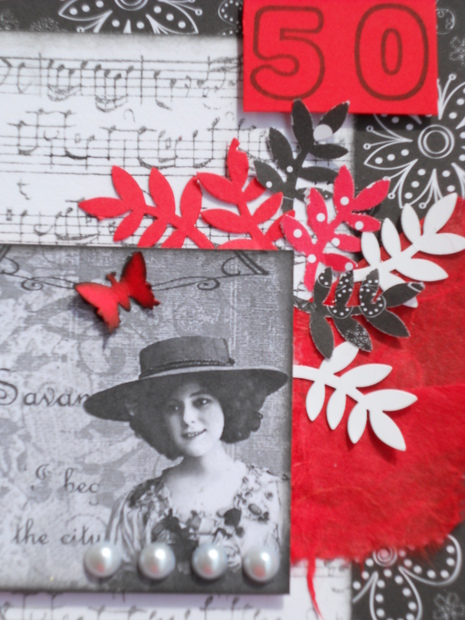 Na každém přání byl jiný černo-bílý podkladový papír, mnou natištěný papír s notami se opakoval, jakož i ruční papír (červený), každé přání mělo jiný obrázek krásné dámy - opět v černobílé barevnosti, vše doplnily výseky (lístečky) a perličky. Zde ještě motýlek přilepen jen za tělíčko.