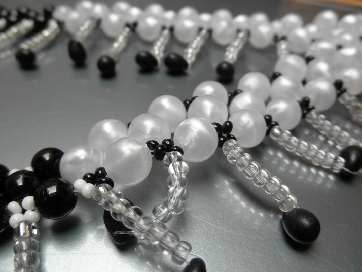 Černo-bílý náhrdelník je přímo na krk. Technika RAW ze bílých plastových korálků (pro odlehčení) s kombinací černých drobných rokajlů a černé mačkané korálky s kombinací bílých rokajlů.