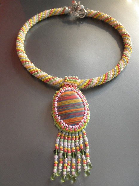 Duhový náhrdelník/spirála je uháčkován ze 6 barev a to šedá, čevená, zelená, růžová a dva odstíny žluté. Vše rokajl. Také obháčkován na pamětovém drátu a zapínání je americké ve tvaru okrasné květiny.