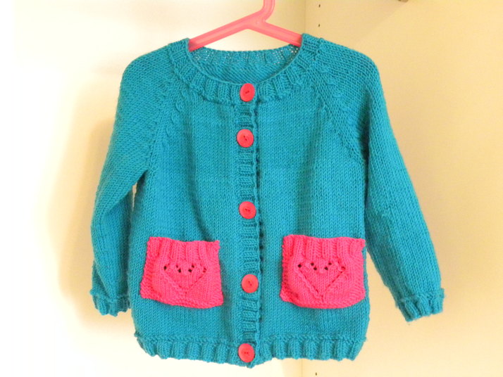 Zimní dívčí svetřík, kapsičky ozdobené vyplétaným srdíčkem.