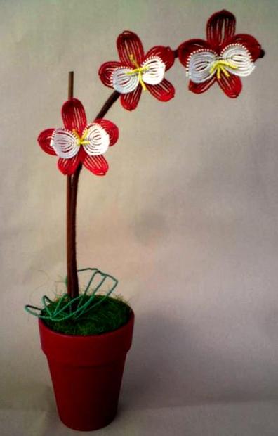 Orchidea je vyrobená z drôtu,korálkov,vlny,papiera,je tam použitá aj sadra na spevnenie a stabilitu orchidey.Nemusíte sa o ňu skoro vôbec starať,stačí raz za mesiac pretrieť vlhkou handričkou,POZOR!!!orchidey nesprchujte a neumývajte pod tečúcou vodou,lebo materiál použitý na kvete by sa mohol zničiť.Kvitne po celý rok:D
