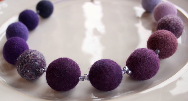 Náhrdelník z dvanácti plstěných kuliček o velikosti cca 2,5 cm. Každá kulička je jiný odstín. Délka náhrdelníku je 58 cm. Navlečeno na trojitém fialovém lanku, doplněno českými ohňovkami (4 mm, fialová se stříbrným leskem). Lze vyrobit podobný na zakázku.