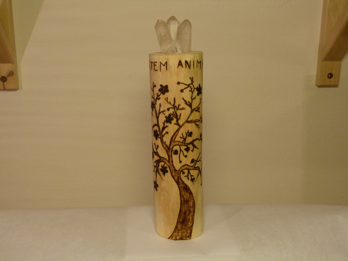 Na přední straně tohoto křišťály zdobeného totemu vidíme rozkvetlý strom s květy, plody a lístky ve tvaru srdce. Totemek byl vyroben pro šťastný pár, který se znovu našel po mnoha letech a symbolika rozkvetlého stromu vyjadřuje přání, aby jejich vztah nadále jen kvetl a přinášel ty nejkrásnější plody. Zadní strana je zdobená totemovými zvířaty obou partnerů, jmény a daty narození.