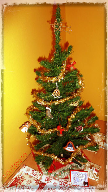 Vlastní malý stromek, ozdobený zvonečky, v pokojíčku s dárky pro mé blízké...