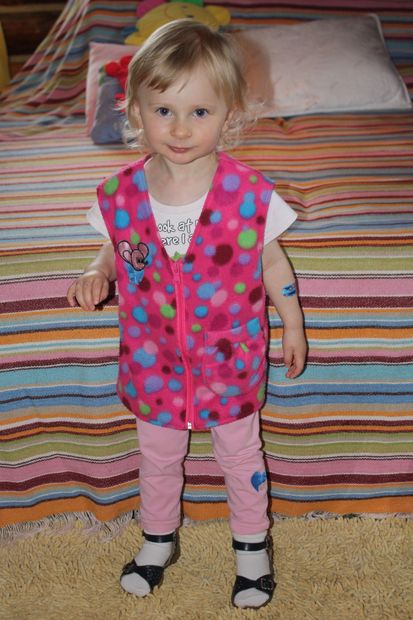 Trochu s nejistotou tu publikuji fotografii naší malé princezny - ale vlastně zároveň i s pýchou. Jak moc jí to sluší! Vestička je z flísu s nášivkou a kapsou na kapesníček. Později se ukázalo, že flís nebyl moc kvalitní, ale co, vestička posloužila dobře.