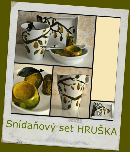 Snídaňový set pro pana Hrušku tvořený na zakázku do společné domácnosti se setem Sovička