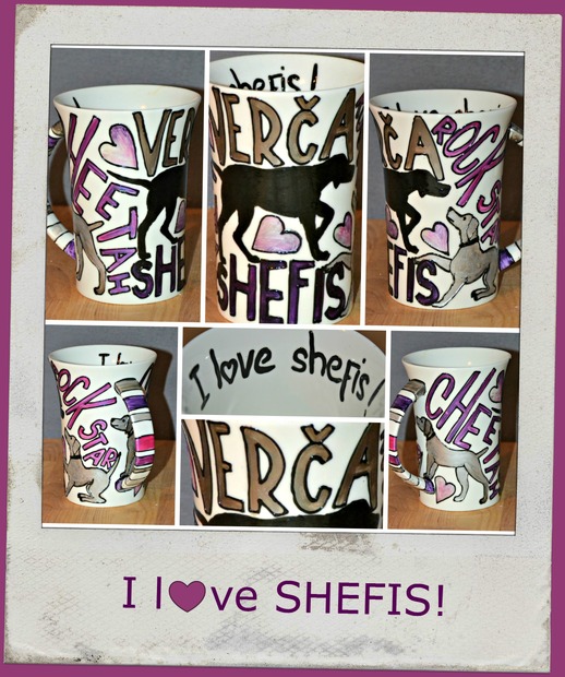 Hrneček na zakázku pro Verču s barvami a logem chovné stanice a dvěma výmarskými ohaři se jmény