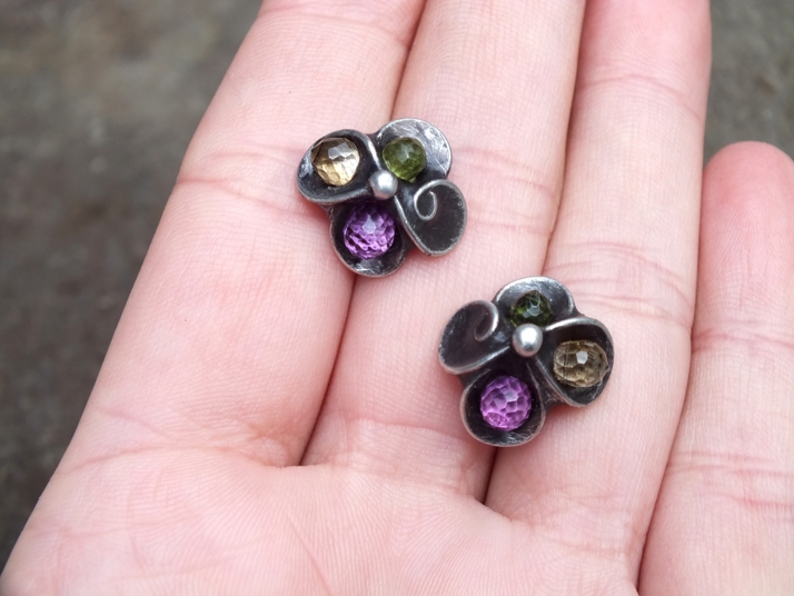 cínované puzetové náušnice, broušené kameny -citrín,olivín,kunzit,