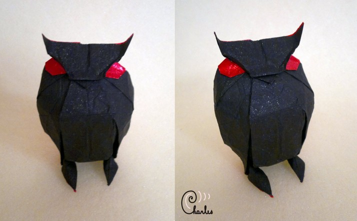 Papírová origami sova z černého hedvábného papíru podlepeného červenou kadeřnickou fólií. Sovu navrhl Nguyen Hung Cuong