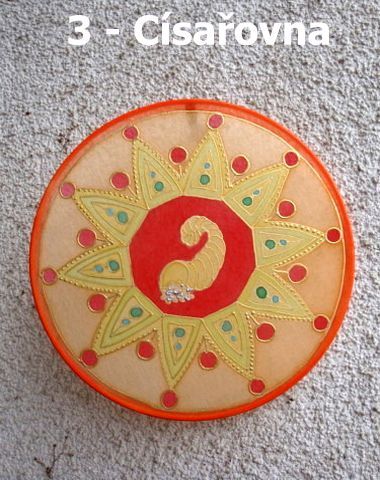 Císařovna - karta moci a postavení ( koruna ), plodnosti ( roh hojnosti ), má ráda hmotné zabezpečení ( zlato a stříbro u rohu ), korunu zdobí rubíny ( spojení mezi tělesnou a duševní láskou ), smaragdy ( úmění naslouchat ) a tyrkysy ( klid v rodině )