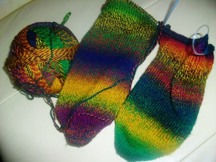 Rozpletené ponožky z Schoppel ZAUBERBALL Crazy - frische Fische 1564 - 100gr., překrásné barvy, jemná nekousavá příze, hřejivá už při pletení. Pleteno od špičky na jedné kulaté jehlici
